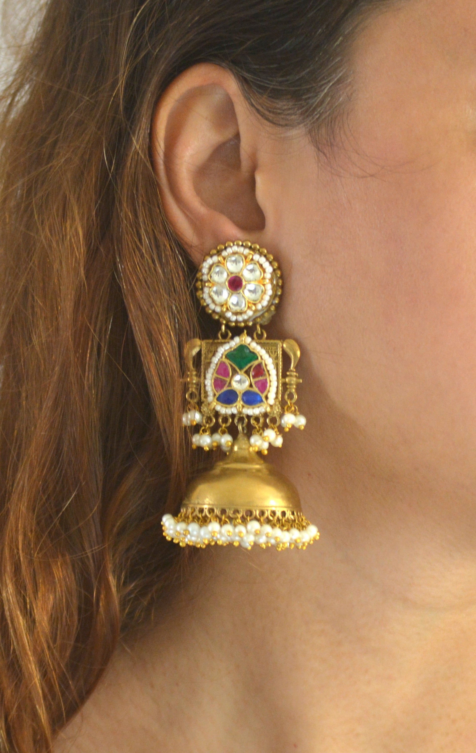 Make a grand statement with these exquisite jhumka earrings, blending classic floral kundan motifs and colorful meenakari designs in green, blue, and red. The upper floral stud is framed by pearls, leading to a square detailing and a bold bell-shaped dangler, also adorned with pearl strings for extra elegance. Perfect for weddings, festive events, or traditional celebrations, these luxurious gold-toned earrings offer timeless charm and stunning appeal to any ethnic ensemble.