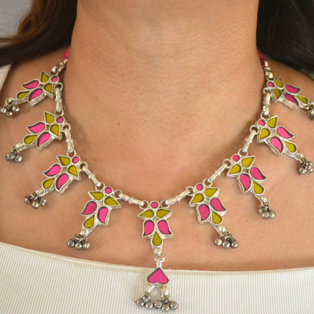 This stunning necklace features bold lotus-inspired motifs with pink and yellow enamel detailing, set in hand cut glass and brass metal for a fresh and festive look. Complemented by playful Ghungroo beads, the design blends traditional Indian aesthetics with modern style, making it an ideal choice for festive occasions, gifting, or standout everyday wear. Add color and elegance to your ethnic ensembles with this vibrant statement piece.