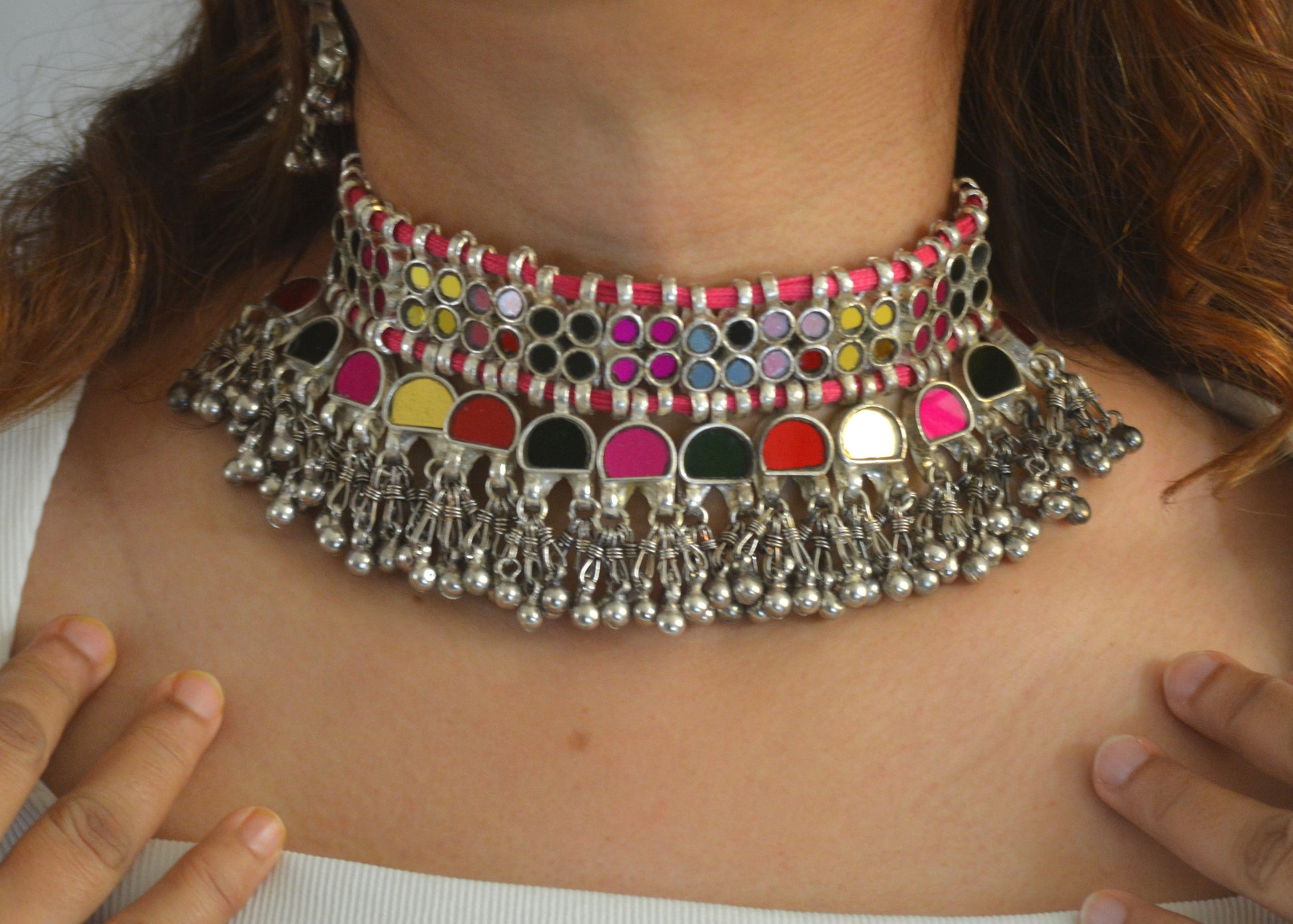 Elevate your ethnic style with this handcrafted glass choker set, featuring vibrant multicolor glasswork set in an brass base. The bold design includes two layers of glass accents, finished with intricate silver ghungroo dangles for a festive and traditional flair. Perfect for weddings, parties, and cultural events, this statement jewellery instantly adds color and sophistication to any outfit.