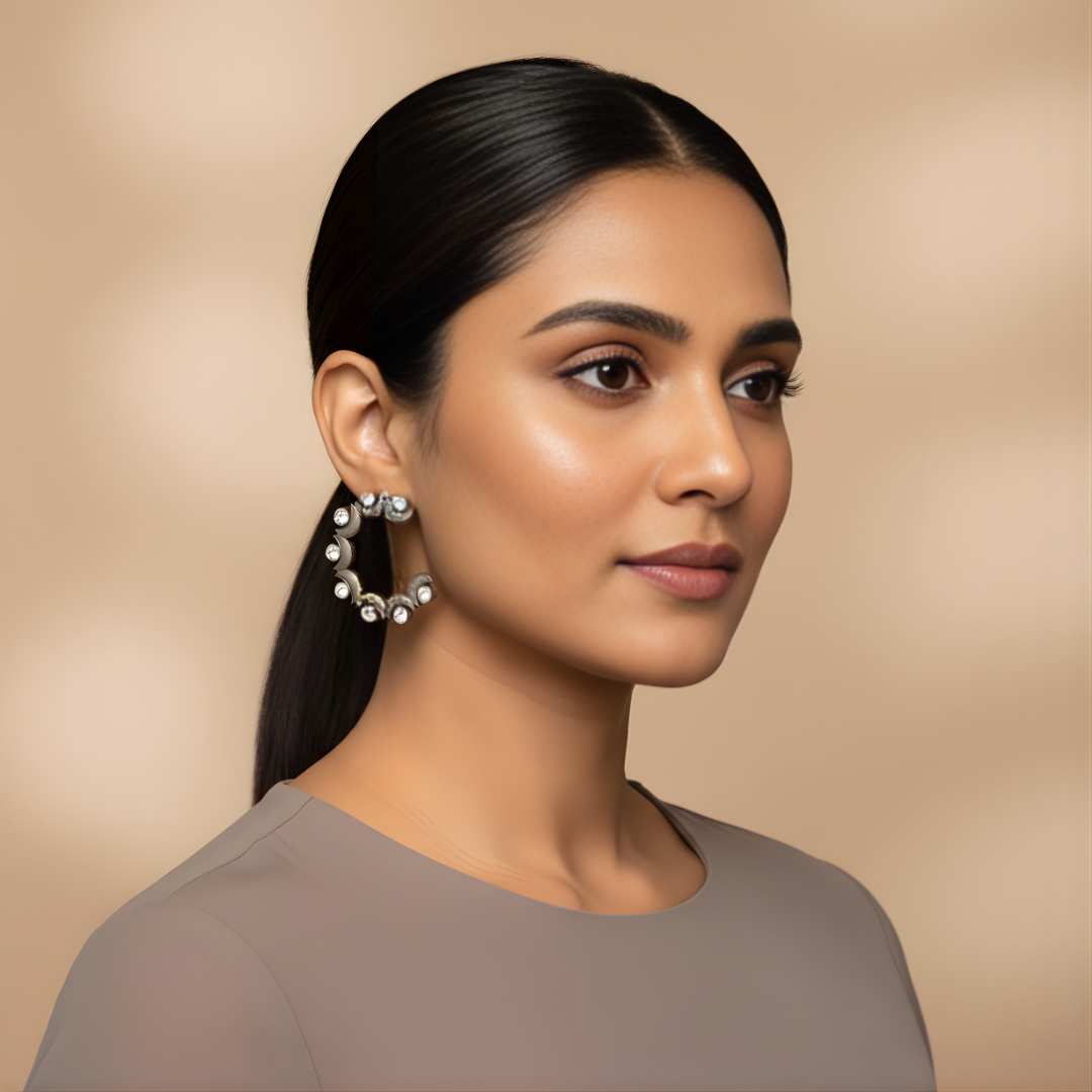 Elevate your look with these stunning crescent moon statement earrings. Crafted with brass finish, each earring features a series of crescent moon shapes accented by sparkling round-cut stones for a luxurious touch. The unique arrangement creates an eye-catching geometric pattern, perfect for both traditional and modern outfits. Lightweight yet bold, these earrings are ideal for festive occasions, parties, or anytime you want to make a chic impression. Add a celestial sparkle to your jewelry collection with these elegant and trendy earrings